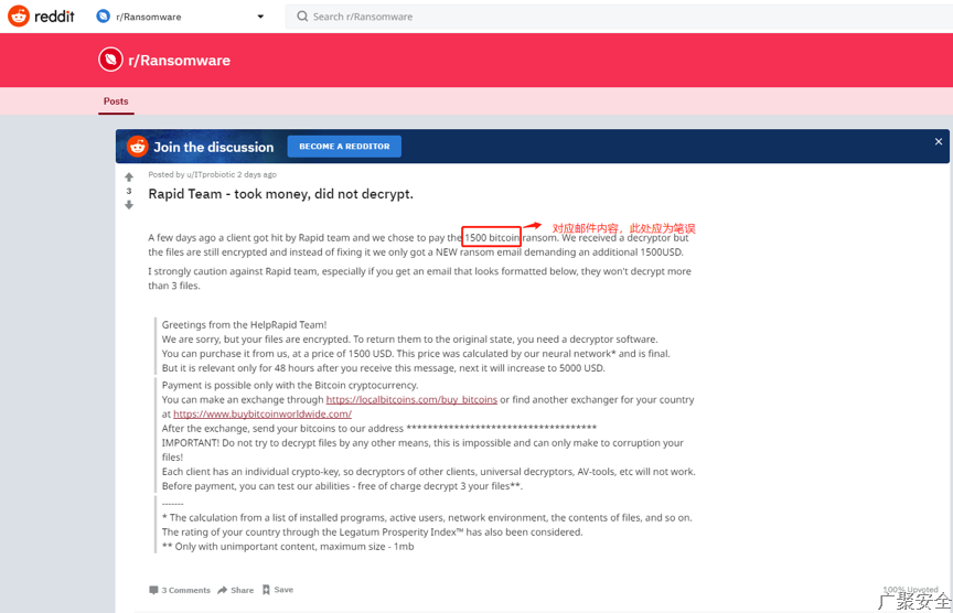 遭遇勒索病毒,你的第一反应是什么?支付赎金解救电脑还是求助安全软件?几天前的一个事故展示了勒索病毒的错误打开方式。国外论坛反馈,几天前有用户遭遇了Rapid勒索病毒,他们选择支付1500美元的赎金,然而收到的解密器并不能“解救”用户被加密的文件,更甚的是,勒索病毒制作者还向受害者发放了一封“额外支付1500美元”的勒索邮件。